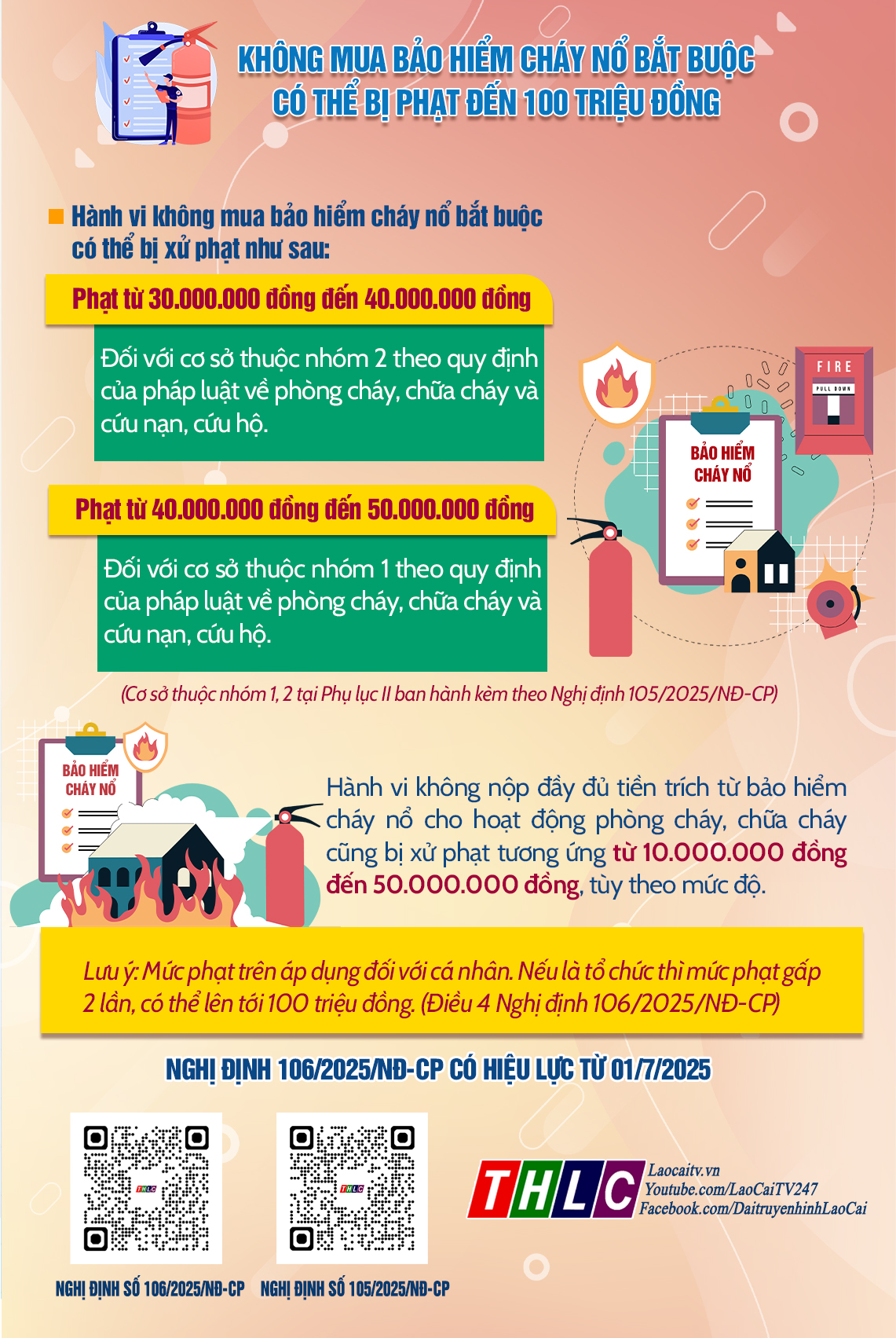Laocaitv.vn - Không mua bảo hiểm cháy nổ bắt buộc có thể bị phạt đến 100 triệu đồng. Mức phạt này được quy định tại Nghị định 106 năm 2025 của Chính phủ về xử phạt vi phạm hành chính trong lĩnh vực phòng cháy, chữa cháy và cứu nạn, cứu hộ.