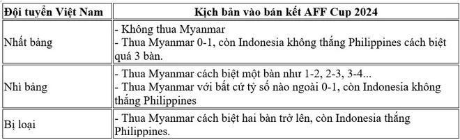- Nếu thua Myanmar, Đội tuyển Việt Nam sẽ vẫn đi tiếp trong trường hợp Indonesia không thắng Philippines.
