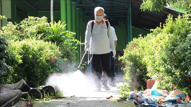Ông Phan Văn Đởm, xã Vị Thủy, huyện Vị Thủy, Hậu Giang phun hóa chất tiêu độc khử trùng lối vào chuồng nuôi lợn của gia đình. Ảnh: Nguyễn Hằng/TTXVN