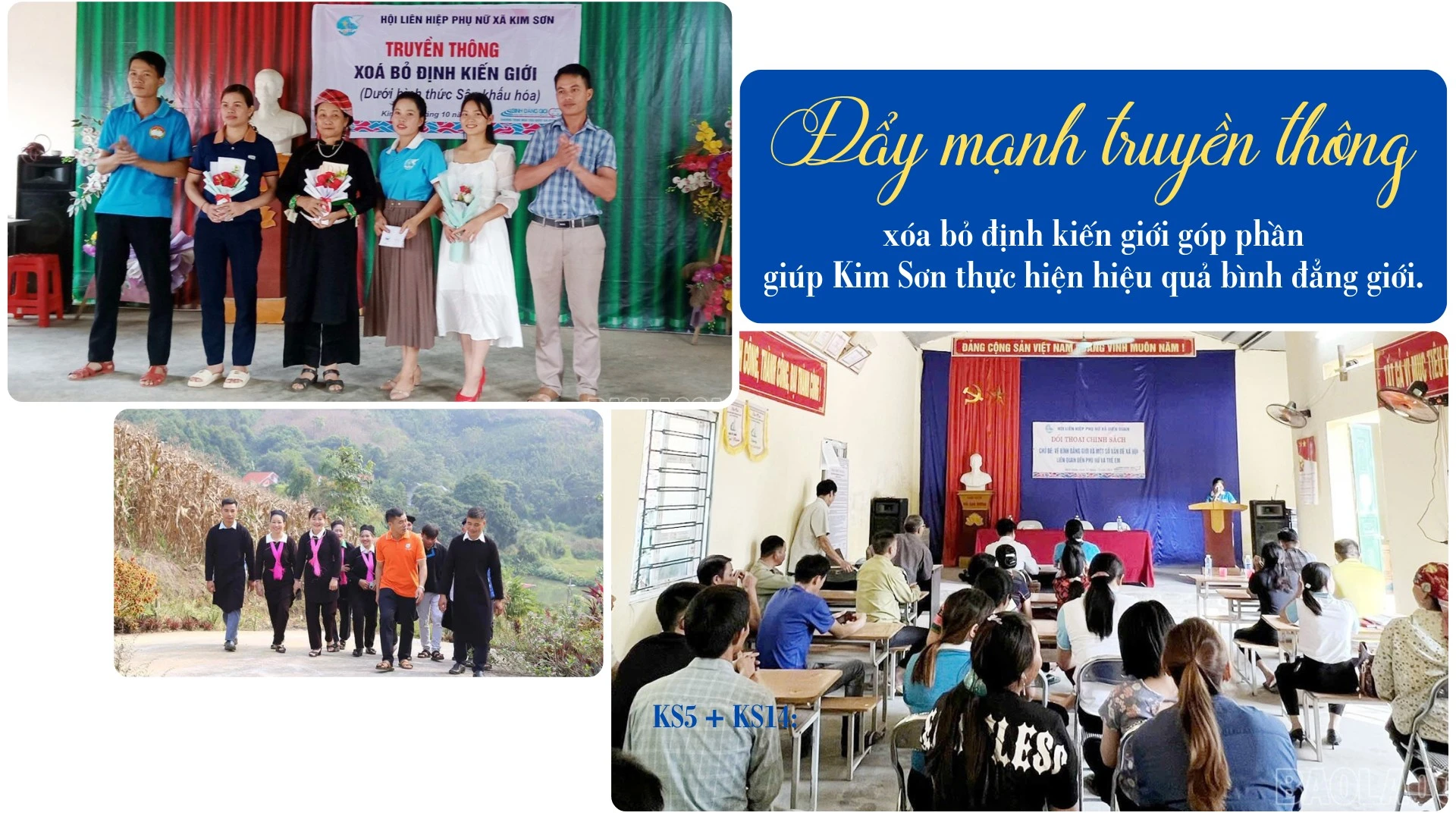 Để phát triển đảng viên nữ, Đảng ủy xã Kim Sơn và các tổ chức đoàn thể cùng Ban Vì sự tiến bộ phụ nữ xã đẩy mạnh truyền thông thực hiện bình đẳng giới, nhất là trong vùng đồng bào dân tộc thiểu số; tăng cường tổ chức các phong trào, hoạt động thu hút phụ nữ tham gia, như: “Phụ nữ tích cực học tập, lao động sáng tạo”, “Xây dựng gia đình 5 không, 3 sạch”, “Nhà sạch, vườn đẹp”, “10 phút góp phần cải thiện môi trường”; “Cổng đẹp - rào xanh - vườn rau tốt”... Qua các hoạt động đó, chị em tự tin thể hiện khả năng của bản thân, khẳng định vị thế, quyền năng của phụ nữ trong gia đình và xã hội…