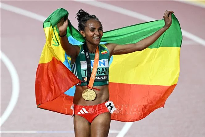Vận động viên Gudaf Tsegay của Ethiopia giành Huy chương Vàng nội dung 10.000 m nữ tại giải vô địch điền kinh thế giới ở Budapest, Hungary ngày 19/8/2023.