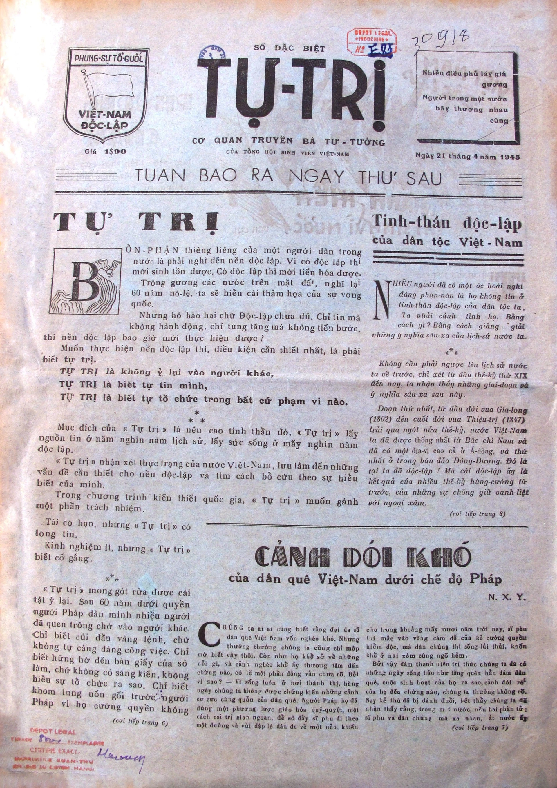 Báo Tự Trị số 1 ra ngày 21-4-1945 do nhà thơ Nguyễn Xuân Sanh làm Chủ bút. Báo in ty-pô, hai bên măng sét được thiết kế khá độc đáo, toát lên tôn chỉ của tổ chức, đoàn thể: “Phụng sự Tổ quốc - Việt Nam độc lập” và khéo léo lồng ghép ca dao, thơ nói về tình đoàn kết, yêu thương đùm bọc lẫn nhau trong khó khăn, hoạn nạn hay trách nhiệm của mỗi người khi Tổ quốc lâm nguy: “Nhiễu điều phủ lấy giá gương/ Người trong một nước phải thương nhau cùng”; “Thương cha con nhớ lo cho nước/ Đừng để giang sơn chịu thiệt thòi”... Ở hai số đầu, báo để trống phần số, ngày ra báo cũng như tòa soạn. Từ số 3 (ngày 4-5-1945), báo đề rõ số và địa chỉ tòa soạn tại Việt Nam Học Xá.