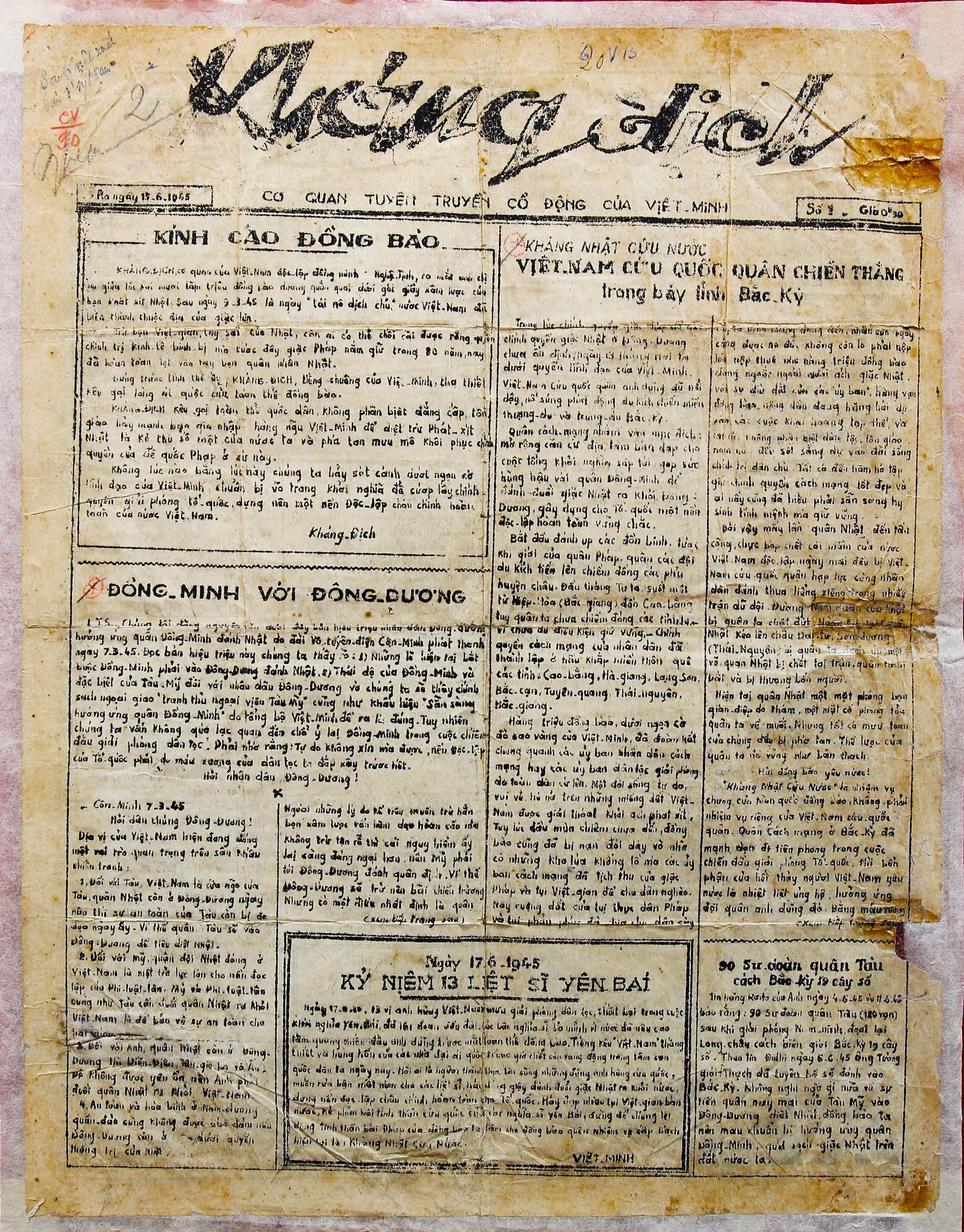 Báo Kháng địch ra số đầu ngày 15-6-1945, xuất bản đến Cách mạng Tháng Tám thì dừng. Báo được in li-tô với nhiều nội dung, từ tình hình trong nước đến quốc tế. Trong lời ra mắt (“Kính cáo đồng bào”) nêu rõ: “Kháng địch kêu gọi toàn thể quốc dân, không phân biệt đẳng cấp, tôn giáo, hãy mạnh bạo gia nhập hàng ngũ Việt Minh để diệt trừ phát xít Nhật là kẻ thù số một của nước ta và phá tan mưu mô khôi phục chính quyền của đế quốc Pháp ở xứ này. Không lúc nào bằng lúc này, chúng ta hãy sát cánh dưới ngọn cờ lãnh đạo của Việt Minh, chuẩn bị võ trang khởi nghĩa để cướp lấy chính quyền, giải phóng tổ quốc, dựng nên một nền độc lập chân chính hoàn toàn của nước Việt Nam”.