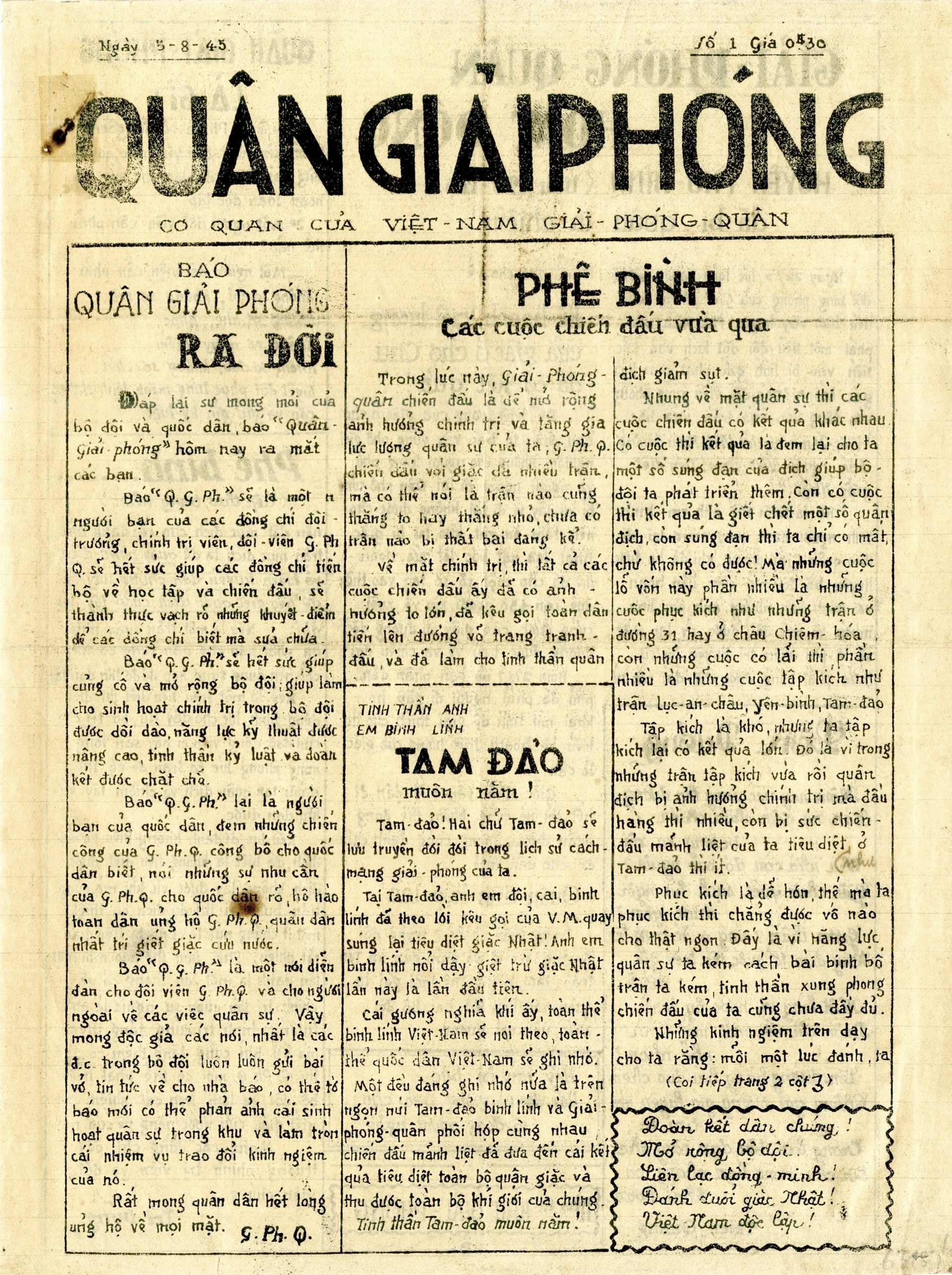 Báo in li-tô, trình bày khá sạch đẹp, rõ ràng. Số đầu tiên ra ngày 5-8-1945 trong bối cảnh đặc biệt: Phe Đồng minh chuẩn bị tấn công phát xít Nhật trên chính đất nước này. Cũng trong tháng 8-1945, Hội nghị đại biểu toàn quốc của Đảng họp tại Tân Trào (Tuyên Quang) khẳng định: “Cơ hội rất tốt cho ta giành độc lập đã tới” và quyết định phát động khởi nghĩa giành chính quyền từ tay phát xít Nhật và tay sai trước khi quân Đồng minh vào Đông Dương. Đáng lưu ý, trong số đầu tiên có đăng bài viết “Phê bình các cuộc chiến đấu vừa qua” của đồng chí Võ Nguyên Giáp với bút danh Trí Dũng. Bài viết thẳng thắn vạch rõ mặt đạt được (về chính trị) và mặt hạn chế (lối đánh) của quân ta, từ đó rút kinh nghiệm cho những trận đánh sau. Ngoài ra, báo có bài cổ vũ tinh thần binh lính tại Tam Đảo đã quay súng trở về với chính nghĩa, phối hợp với Giải phóng quân cùng anh dũng chiến đấu tiêu diệt được toàn bộ quân Nhật tại Tam Đảo.