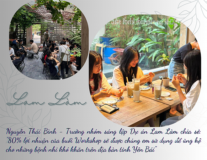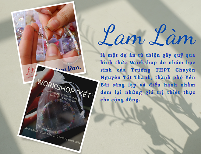 Chia sẻ về dự án lần này, em Nguyễn Thái Bình – học sinh lớp 12 Anh - Trung, Trường THPT Chuyên Nguyễn Tất Thành cho biết: "Dự án "Lam Làm”của chúng em ra đời với mục đích giúp đỡ và đồng hành với những hoàn cảnh đặc biệt trong cuộc sống, đồng thời mong muốn tiếp cận với mô hình mới là "Workshop” - nơi mọi người có cơ hội được trải nghiệm hoạt động mới và phát huy sức sáng tạo của mình thông qua việc làm những sản phẩm thủ công. Chúng em chọn hình thức gây quỹ qua Workshop với hi vọng mang lại những trải nghiệm thú vị bằng cách tạo ra những sản phẩm thủ công trong đời sống, sinh hoạt hàng ngày. Đồng thời kết nối mọi người tới gần nhau hơn".