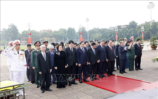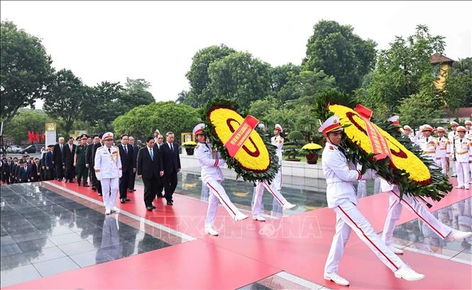 Đoàn đại biểu Ban Chấp hành Trung ương Đảng, Chủ tịch nước, Quốc hội, Chính phủ, Ủy ban Trung ương Mặt trận Tổ quốc Việt Nam đặt vòng hoa, vào Lăng viếng Chủ tịch Hồ Chí Minh. Ảnh: Doãn Tấn/TTXVN