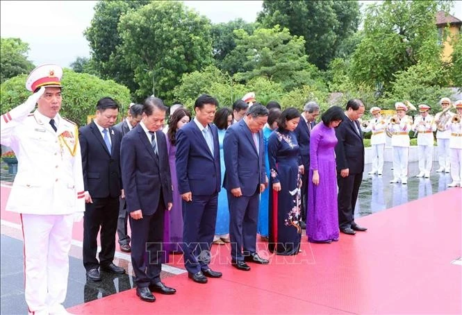 Đoàn đại biểu Thành ủy, HĐND, UBND, MTTQ Việt Nam thành phố Hà Nội đến đặt vòng hoa, tưởng niệm các Anh hùng liệt sĩ. Ảnh: Phạm Kiên/TTXVN
