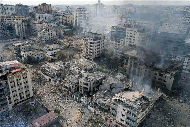 Những tòa nhà bị phá hủy sau các cuộc không kích của Israel xuống thành phố Gaza, ngày 10/10/2023.