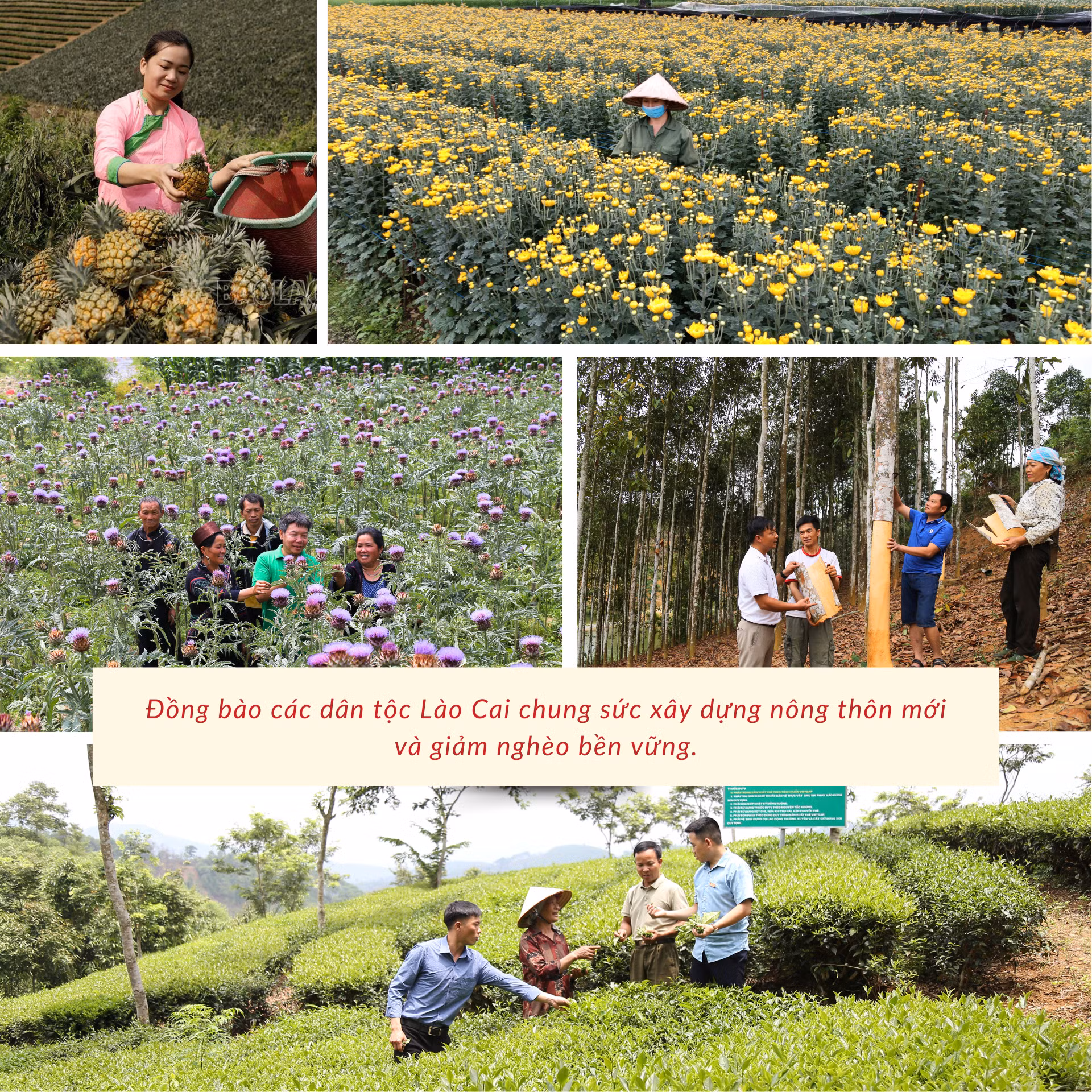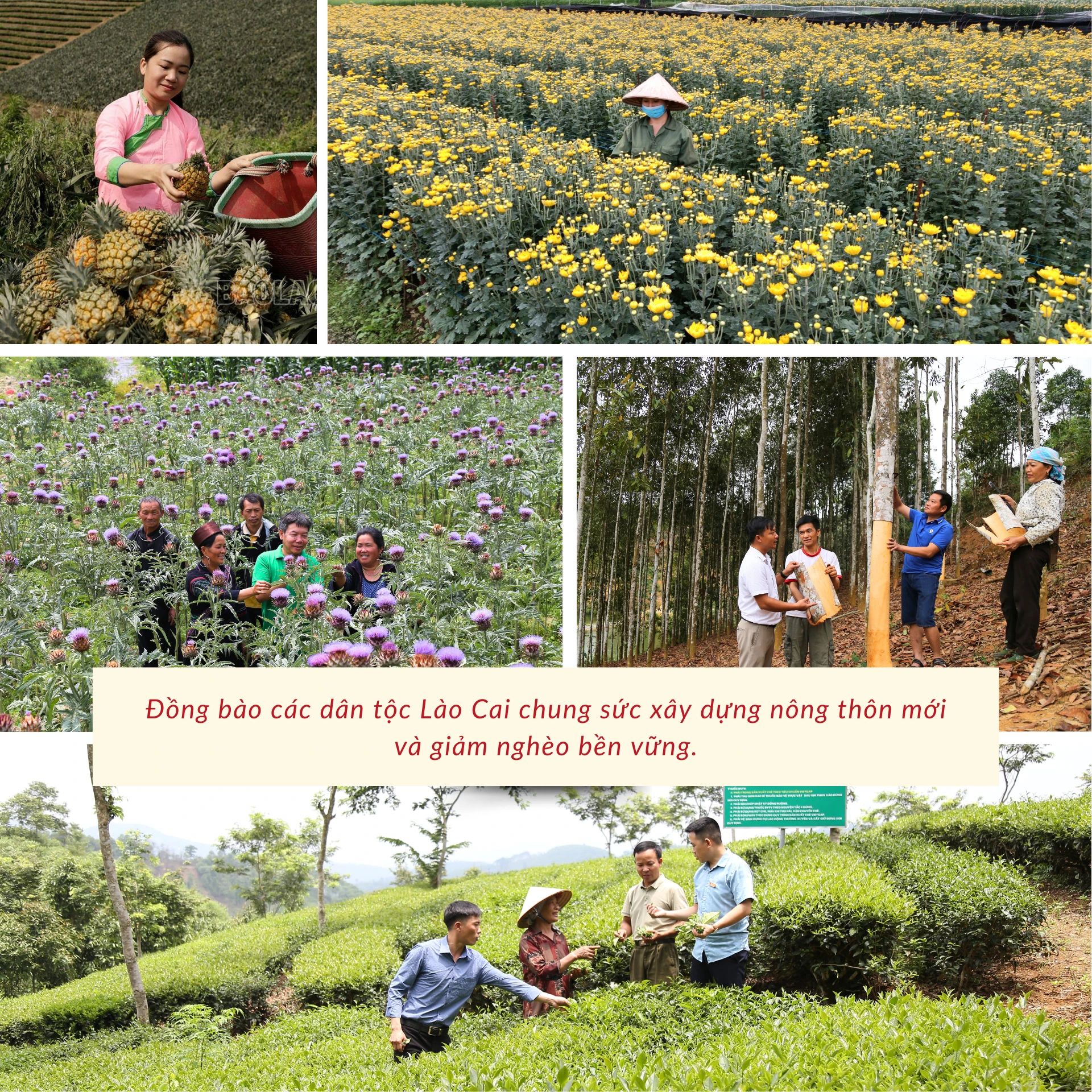 Đặc biệt, ngày 26/8/2021, Ban Thường vụ Tỉnh ủy Lào Cai ban hành Nghị quyết số 10-NQ/TU về chiến lược phát triển nông nghiệp hàng hóa tỉnh Lào Cai đến năm 2030, tầm nhìn đến năm 2050, trong đó tập trung đầu tư cho vùng đồng bào dân tộc thiểu số. Theo đó, UBND tỉnh và chính quyền các địa phương đã chỉ đạo công tác khuyến nông, khuyến lâm, hướng dẫn thâm canh tăng vụ; cung cấp, hỗ trợ giống mới có năng suất cao để người dân các xã vùng cao chuyển đổi cơ cấu cây trồng, vật nuôi, chuyển đổi tập quán canh tác nhỏ lẻ sang phát triển sản xuất nông nghiệp tập trung theo hướng hàng hóa... Đến nay, trên địa bàn các địa phương vùng cao, vùng dân tộc thiểu số của tỉnh đã hình thành nhiều vùng sản xuất chuyên canh tập trung đạt giá trị kinh tế cao, như cánh đồng một giống lúa tại huyện Văn Bàn, vùng lúa Séng Cù chất lượng cao tại huyện Mường Khương, huyện Bát Xát; vùng ngô hàng hóa ở các huyện Si Ma Cai, Bắc Hà; vùng dứa, chuối ở huyện Mường Khương... Đến hết năm 2023, toàn tỉnh có 196 sản phẩm OCOP từ 3 sao trở lên, giá trị sản phẩm trên 1 ha canh tác tăng từ 80 triệu đồng năm 2019 lên 97 triệu đồng năm 2023. Kinh tế tập thể, hợp tác xã nông nghiệp trên địa bàn tỉnh tiếp tục phát triển đa dạng về số lượng, chất lượng.
