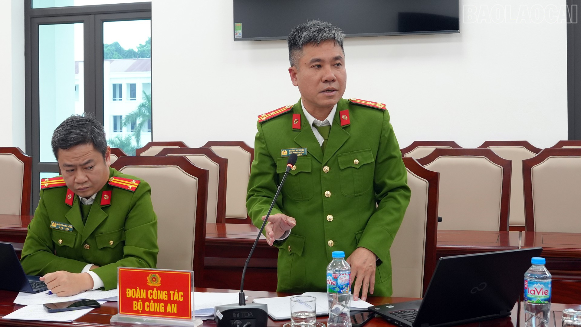 Đồng chí đại tá Trần Quốc Huy - Ủy viên Ban Thường vụ Đảng ủy, Phó Giám đốc Công an tỉnh, Thủ trưởng Cơ quan Cảnh sát điều tra Công an tỉnh chủ trì buổi tiếp và làm việc với đoàn.