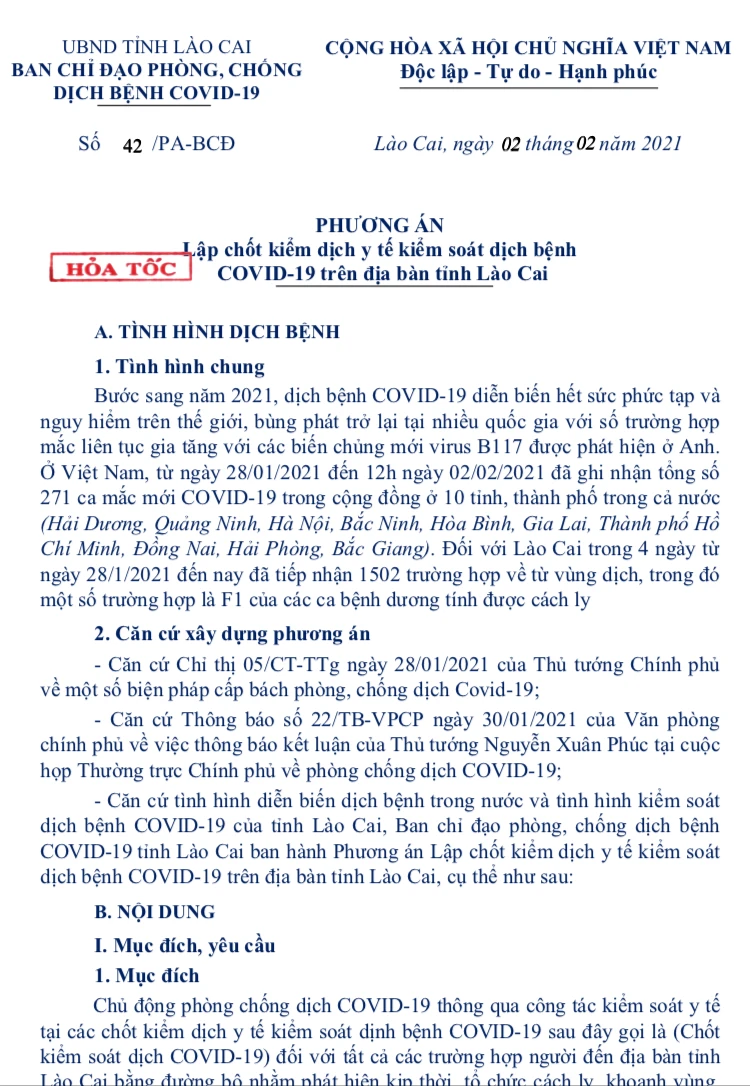 LCĐT - Ngày 2/2, Ban Chỉ đạo Phòng, chống dịch bệnh Covid -19 tỉnh Lào Cai ký phương án số 42/PA –BCĐ về việc lập chốt kiểm dịch y tế kiểm soát dịch bệnh Covid – 19 trên địa bàn.