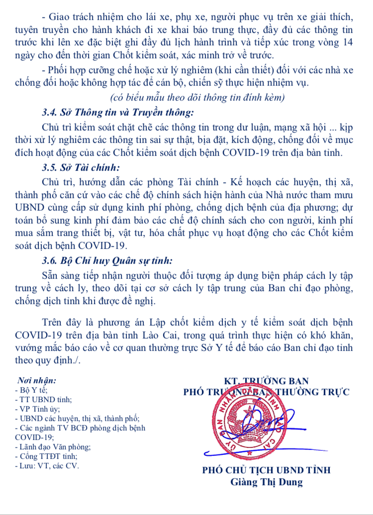 Theo đó, Lào Cai sẽ lập 8 chốt kiểm dịch y tế kiểm soát dịch bệnh Covid – 19 tại các tuyến đường bộ vào tỉnh. Trong đó, đường cao tốc Nội Bài – Lào Cai lập 3 chốt: Nút giao IC 16 (thuộc xã Tân Thượng, huyện Văn Bàn); nút giao IC 17 (thuộc xã Xuân Giao) và Trạm thu phí Km 237 (thuộc xã Gia Phú, huyện Bảo Thắng). Quốc lộ 70 lập 1 chốt kiểm soát tại đoạn bắt đầu vào xã Phúc Khánh, huyện Bảo Yên (giáp tỉnh Yên Bái). Quốc lộ 279 lập 2 chốt kiểm soát, đoạn bắt đầu vào xã Nậm Xé, huyện Văn Bàn (đèo Khau Co, giáp tỉnh Lai Châu) và đoạn bắt đầu vào xã Nghĩa Đô, huyện Bảo Yên (giáp tỉnh Hà Giang). Quốc lộ 4D lập 1 chốt kiểm soát tại đỉnh đèo Ô Quý Hồ, thị xã Sa Pa (giáp với tỉnh Lai Châu). 1 chốt kiểm soát tại đường bộ thuộc huyện Bắc Hà giáp với huyện Xín Mần, tỉnh Hà Giang.