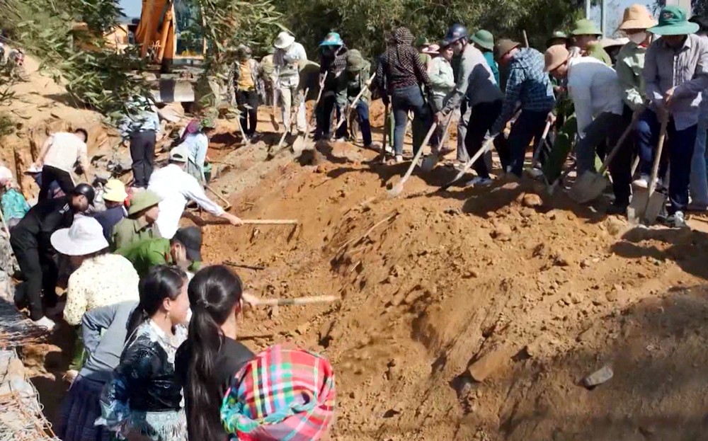 Cán bộ và nhân dân cùng tham gia mở rộng tuyến đường lên bản Cu Vai, xã Xà Hồ, huyện Trạm Tấu.
