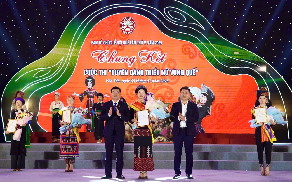Lãnh đạo huyện Văn Yên trao giải Nhất Cuộc thi "Duyên dáng thiếu nữ vùng quế” cho thí sinh Vũ Phan Hà Chi - Thị trấn Mậu A.