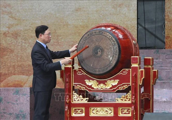 Chủ tịch UBND tỉnh Bắc Giang Lê Ánh Dương đánh trống khai hội. Ảnh: Danh Lam/TTXVN
