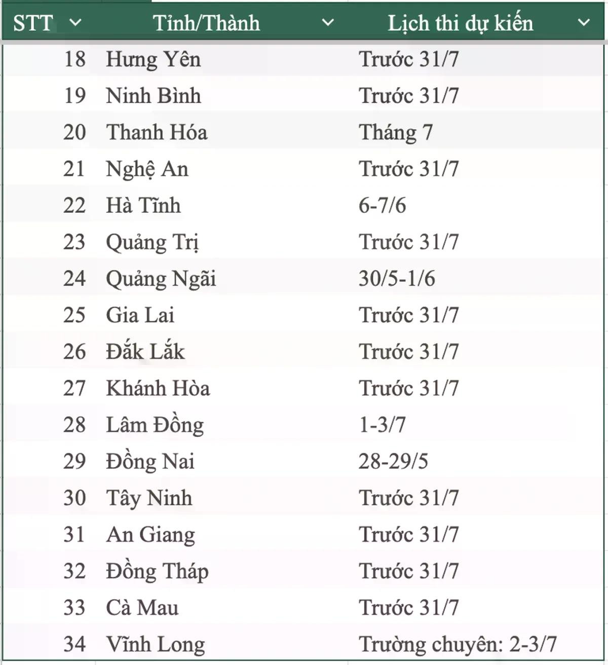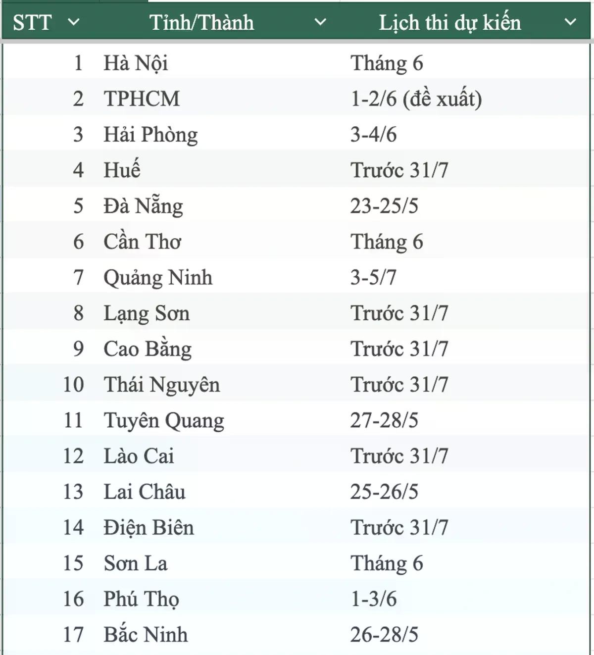 Theo ghi nhận, một số địa phương dự kiến tổ chức kỳ thi từ cuối tháng 5. Đà Nẵng là địa phương có lịch thi sớm nhất khi dự kiến tổ chức từ ngày 23 đến 25/5. Các tỉnh như Lai Châu, Tuyên Quang, Bắc Ninh, Đồng Nai và Quảng Ngãi cũng lên kế hoạch thi trong khoảng từ ngày 25/5 đến đầu tháng 6.