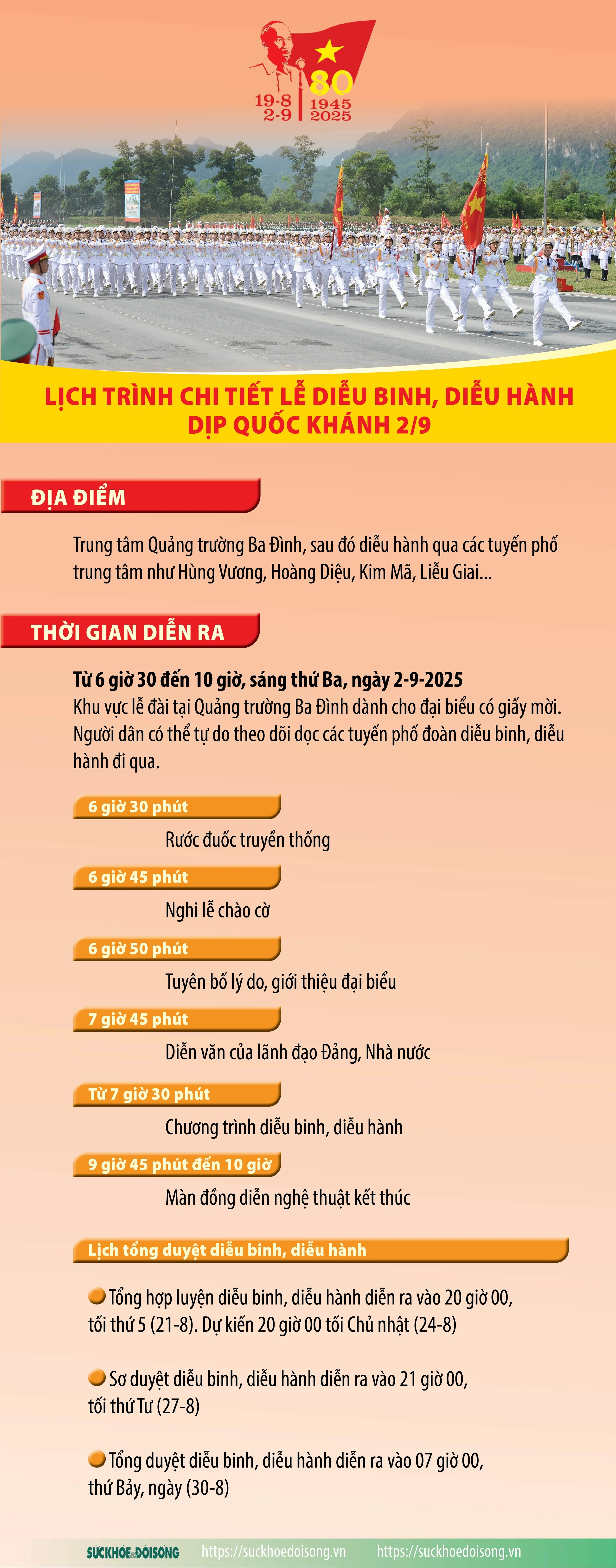 Báo Sức khỏe và Đời sống trân trọng giới thiệu đến bạn đọc lịch trình chi tiết các buổi tổng hợp luyện, sơ duyệt, tổng duyệt và Lễ diễu binh, diễu hành chính thức diễn ra tại Quảng trường Ba Đình, Thủ đô Hà Nội.