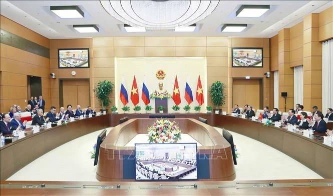 Tại hội đàm, thay mặt Quốc hội Việt Nam, Chủ tịch Quốc hội nồng nhiệt chào mừng Chủ tịch Vyacheslav Victorovich Volodin và các thành viên cấp cao của Duma Quốc gia Quốc hội Liên bang Nga thăm chính thức Việt Nam.