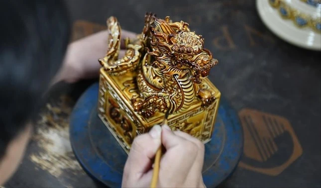 Nghệ nhân Bát Tràng tạo đường nét lên chiếc ấn rồng bằng gốm.