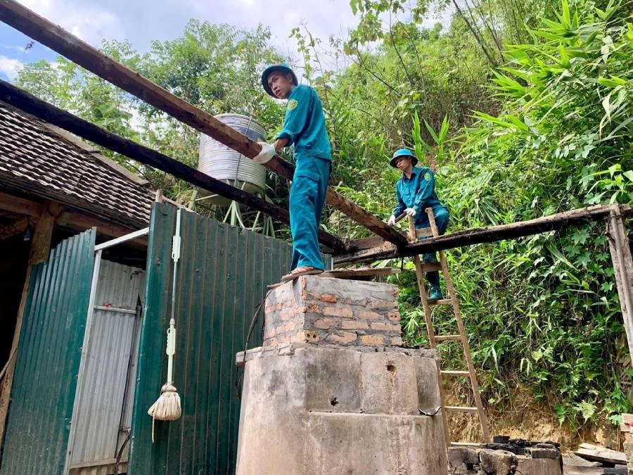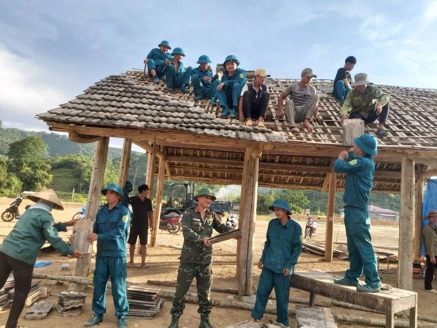 LLVT huyện bảo Yên đang đang lợp lại mái nhà cho ông Đặng Văn Kim ở khu tái định cư.
