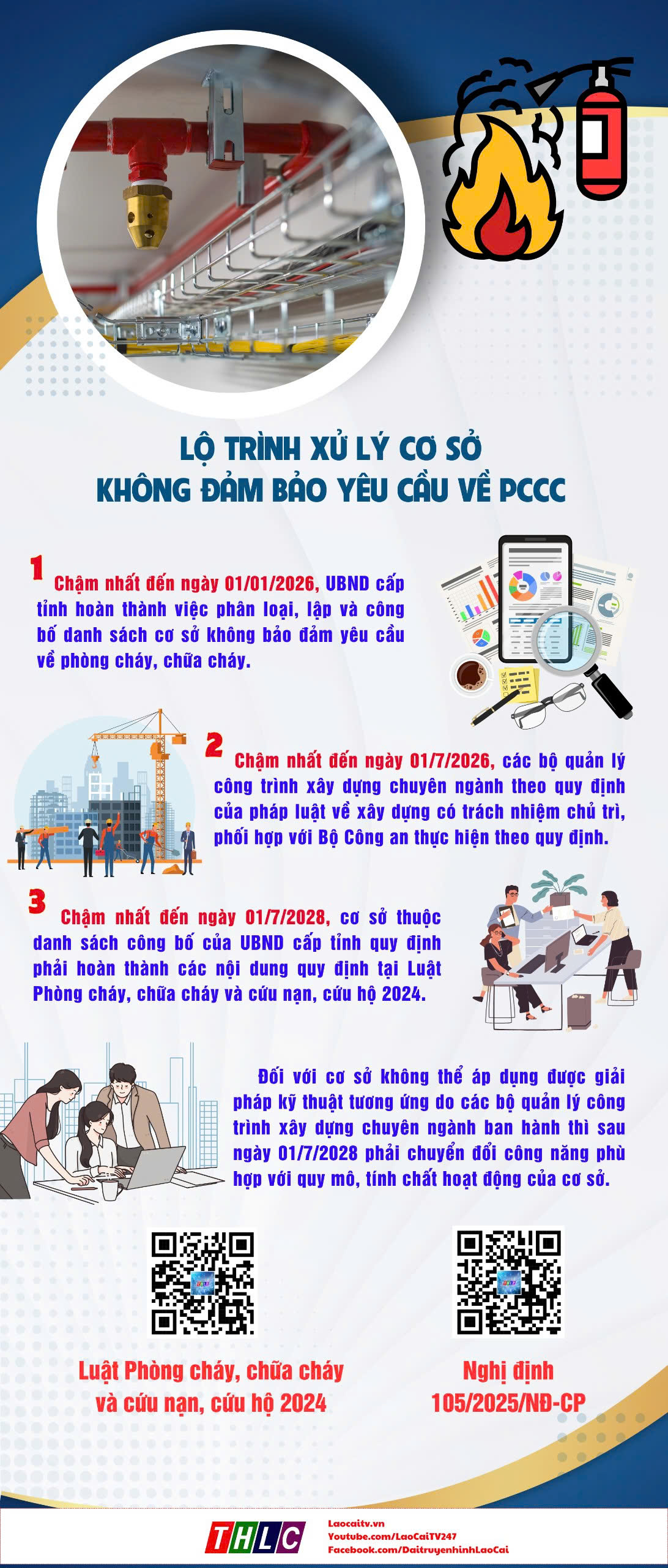 Laocaitv.vn - Điều 43 Nghị định 105/2025 của Chính phủ quy định về lộ trình xử lý đối với những cơ sở không đảm bảo yêu cầu về phòng cháy, chữa cháy được đưa vào sử dụng trước ngày 01/7/2025 như sau: