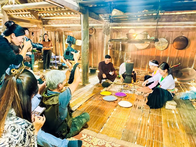 Du khách trải nghiệm nấu xôi ngũ sắc tại nhà sàn truyền thống của đồng bào dân tộc Mường.
