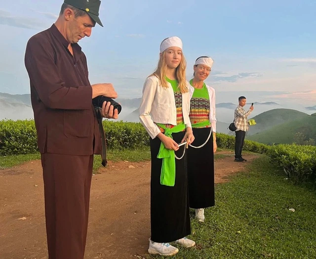 Du khách quốc tế tại đồi chè Long Cốc.