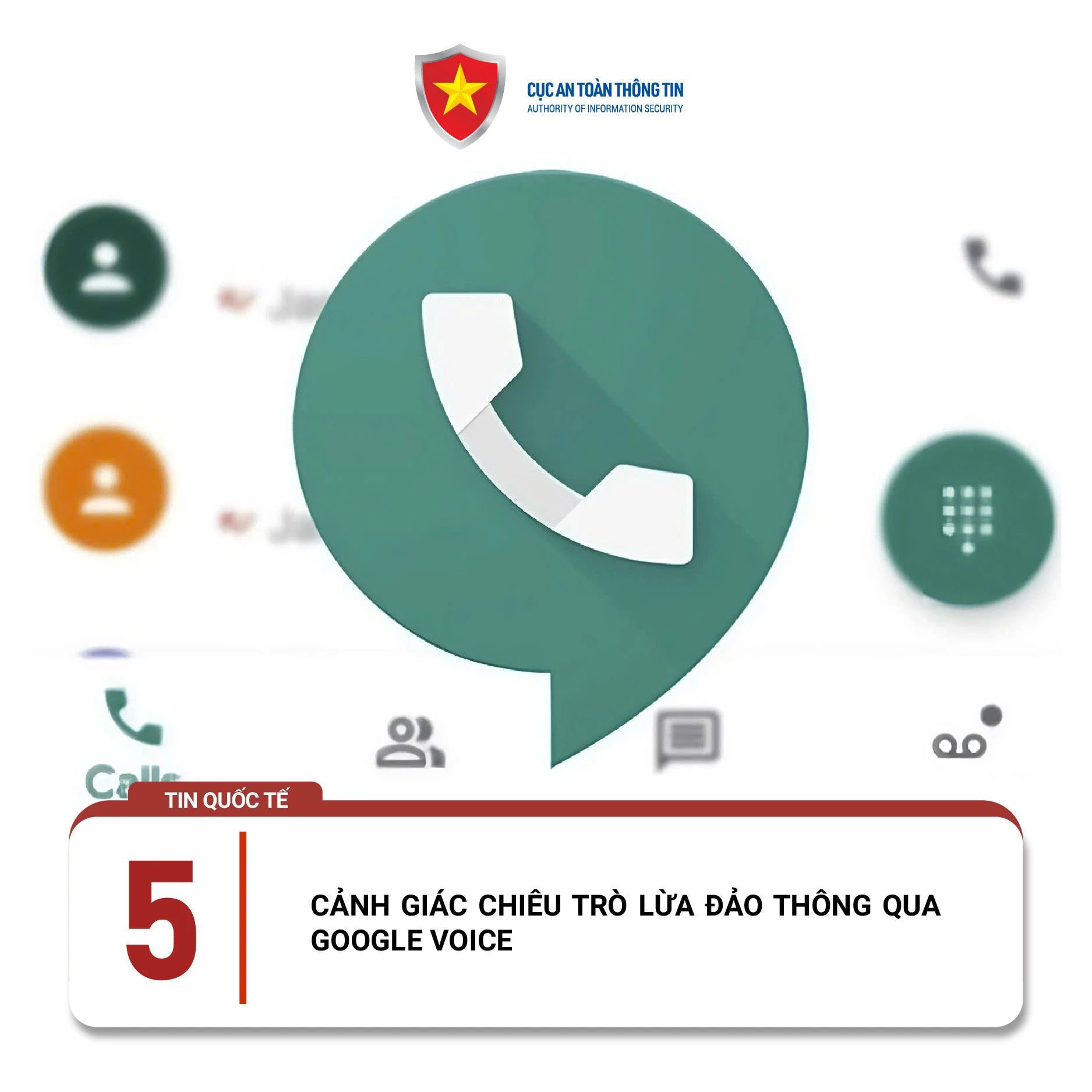 Thông tin về tình hình an toàn thông tin mạng tuần qua, Cục An toàn thông tin (Bộ Thông tin và Truyền thông) cho biết, tại Mỹ đã xuất hiện hành vi lừa đảo mới nhắm vào số điện thoại của người dân thông qua dịch vụ điện thoại Google Voice (là dịch vụ điện thoại internet miễn phí dành cho mọi người có tài khoản Gmail cho phép người dùng thực hiện và nhận cuộc gọi, gửi và nhận tin nhắn văn bản, sử dụng thư thoại…).