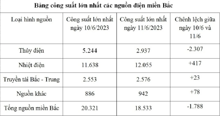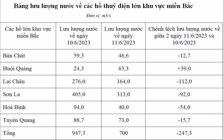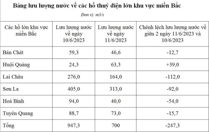 Cụ thể, trong ngày 11/6, tổng lưu lượng nước về các hồ thủy điện lớn miền Bắc giảm 26% so với lưu lượng nước về ngày 10/6, mực nước các hồ có phần sụt giảm. Cụ thể, mực nước hồ thủy điện Lai Châu giảm 0,7m so với ngày 10/6, hồ Hòa Bình còn cách mực nước chết 23,1m, công suất không huy động được khoảng 5.000 MW.