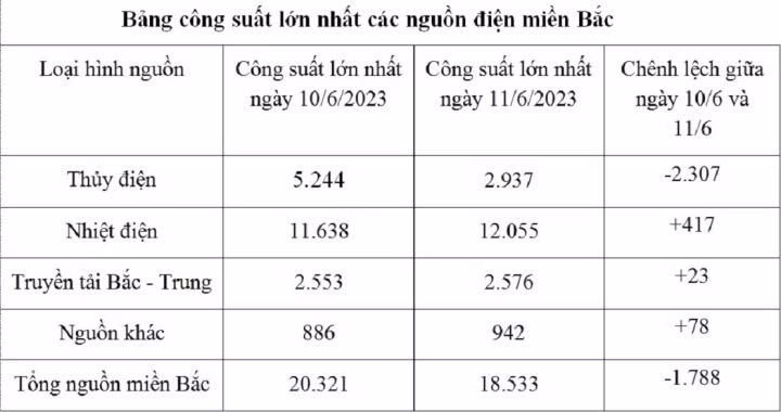 Trước đó, theo thông tin từ Trung tâm điều độ hệ thống điện Quốc gia (AO), ngày 10/6, tổng công suất nguồn khả dụng miền Bắc đạt 20.321 MW, trong đó công suất khả dụng của thủy điện là 5.244 MW.