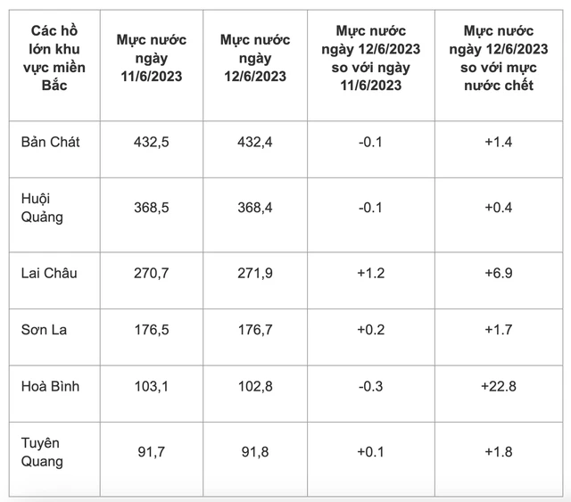 Ngày 12/6, mực nước các hồ thuỷ điện đã trên mực nước chết, đặc biệt hồ Hoà Bình cao hơn mực nước chết 22,8m, hồ Lai Châu là 6,9 m.