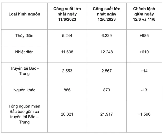 Công suất lớn nhất loại hình nguồn điện khu vực miền Bắc ngày 12/6/2023