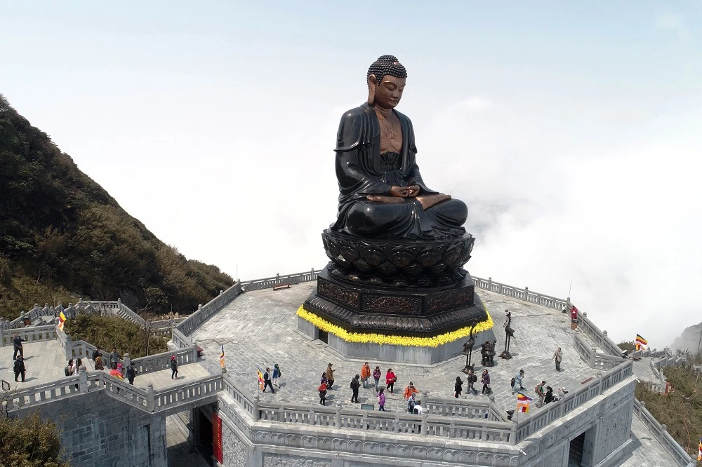 Trên khu vực đỉnh, trong gió núi mây vờn, bạn sẽ được dạo bước trong an nhiên, để chiêm bái những công trình tâm linh huyền hoặc. Đó là Đại tượng Phật A Di Đà cao nhất Việt Nam bề thế, uy nghi giữa cao xanh, mái ngói nâu của những Kim Sơn Bảo Thắng Tự, Bảo An Thiền Tự, miếu Sơn Thần… trầm mặc như thể đã tồn tại qua bao đời.