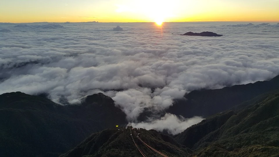 Đứng từ khu vực đỉnh Fansipan nhìn xuống, một biển mây bồng cuồn cuộn đổ tràn qua những chóp núi của dãy Hoàng Liên, đẹp tựa bồng lai tiên cảnh.