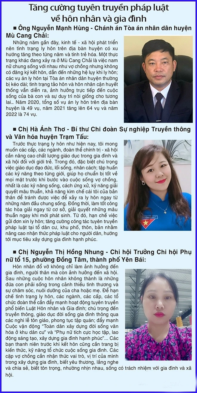 Tại Yên Bái, tỷ lệ án hôn nhân những năm gần đây tương đối cao mà thành phố Yên Bái là một ví dụ. Năm 2020, Tòa án nhân dân thành phố Yên Bái thụ lý giải quyết 438 vụ án ly hôn; năm 2021 thụ lý 367 vụ; từ đầu năm 2022 đến nay, thụ lý giải quyết 295 vụ.