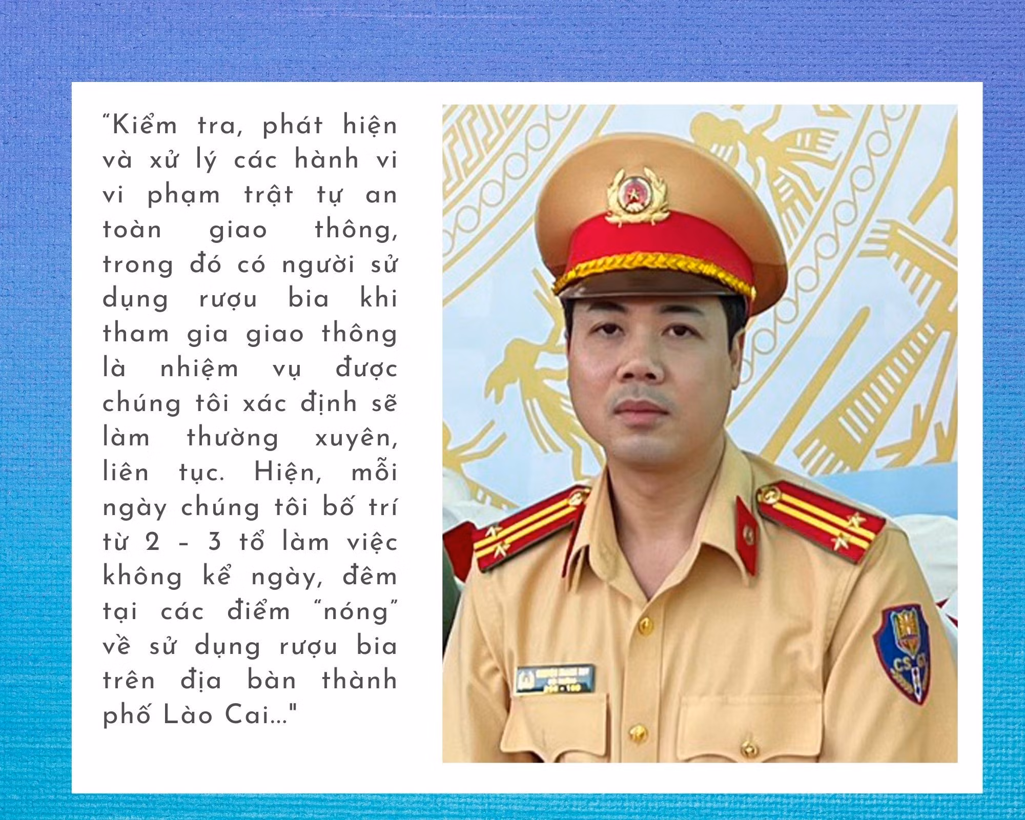 Trung tá Nguyễn Khánh Duy, Đội trưởng Đội Cảnh sát giao thông - trật tự (Công an thành phố Lào Cai) khẳng định: Kiểm tra, phát hiện và xử lý các hành vi vi phạm trật tự an toàn giao thông, trong đó có người sử dụng rượu, bia khi tham gia giao thông là nhiệm vụ được duy trì thường xuyên, liên tục. Hiện nay, trên địa bàn thành phố mỗi ngày chúng tôi bố trí 2 - 3 tổ làm việc không kể ngày, đêm tại các tuyến đường “nóng” mà lái xe sử dụng rượu, bia thường đi qua. Khi phát hiện người điều khiển phương tiện giao thông có nồng độ cồn vượt mức cho phép, chúng tôi sẽ lập biên bản xử lý nghiêm theo quy định của pháp luật.