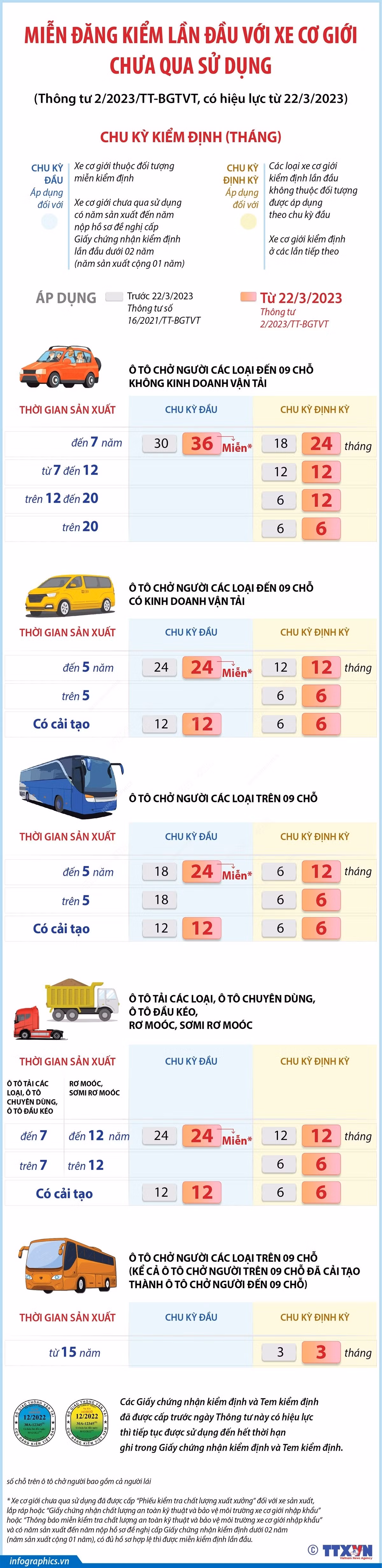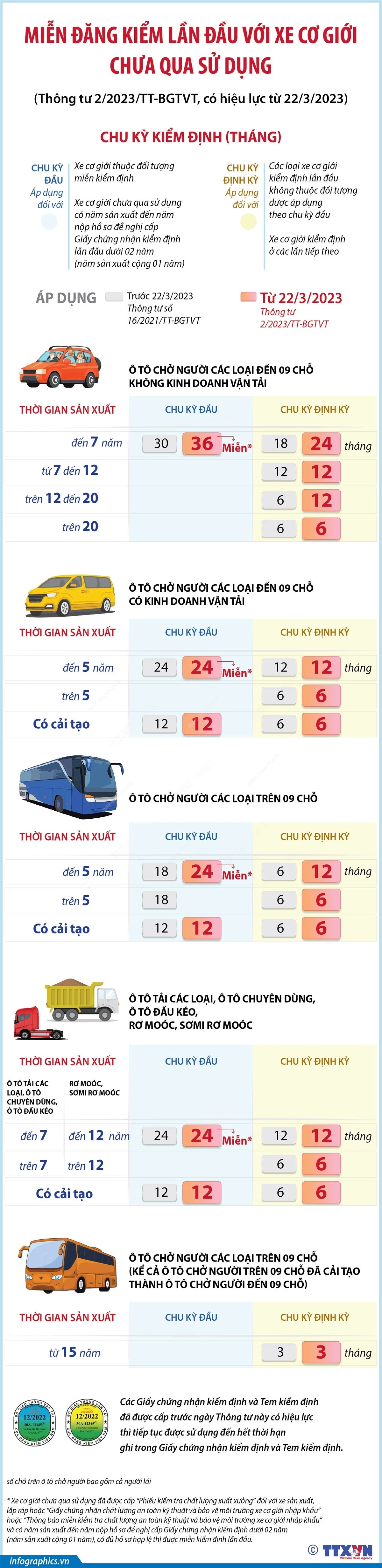 Bộ Giao thông vận tải ban hành Thông tư 2/2023/TT-BGTVT sửa đổi, bổ sung Thông tư 16/2021/TT-BGTVT quy định về kiểm định an toàn kỹ thuật và bảo vệ môi trường phương tiện giao thông cơ giới đường bộ. Trong đó, có hai nội dung đáng chú ý. Đó là miễn kiểm định lần đầu đối với xe cơ giới chưa qua sử dụng và điều chỉnh chu kỳ kiểm định một số loại xe cơ giới. Thông tư có hiệu lực từ 22/3/2023.