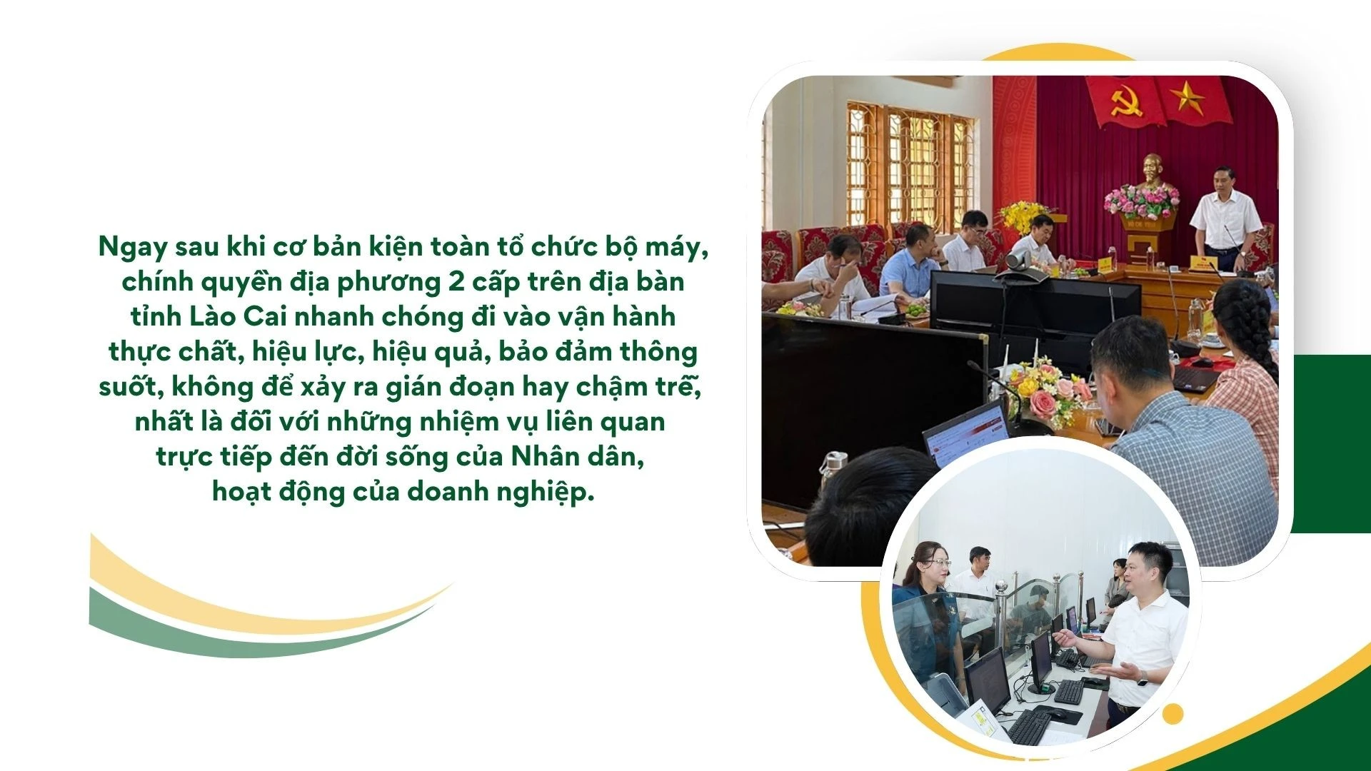 Ngay sau khi cơ bản kiện toàn tổ chức bộ máy và ổn định hoạt động của các cơ quan, đơn vị sau hợp nhất, tỉnh Lào Cai bước vào giai đoạn chuyển tiếp quan trọng. Yêu cầu đặt ra là thiết lập hệ thống cơ chế, chính sách, quyết định phương án, kế hoạch phát triển kinh tế - xã hội, đồng thời bộ máy chính quyền địa phương 2 cấp phải nhanh chóng đi vào vận hành thực chất, hiệu lực, hiệu quả, bảo đảm thông suốt, không để xảy ra gián đoạn hay chậm trễ, nhất là đối với những nhiệm vụ liên quan trực tiếp đến đời sống của Nhân dân, hoạt động của doanh nghiệp.