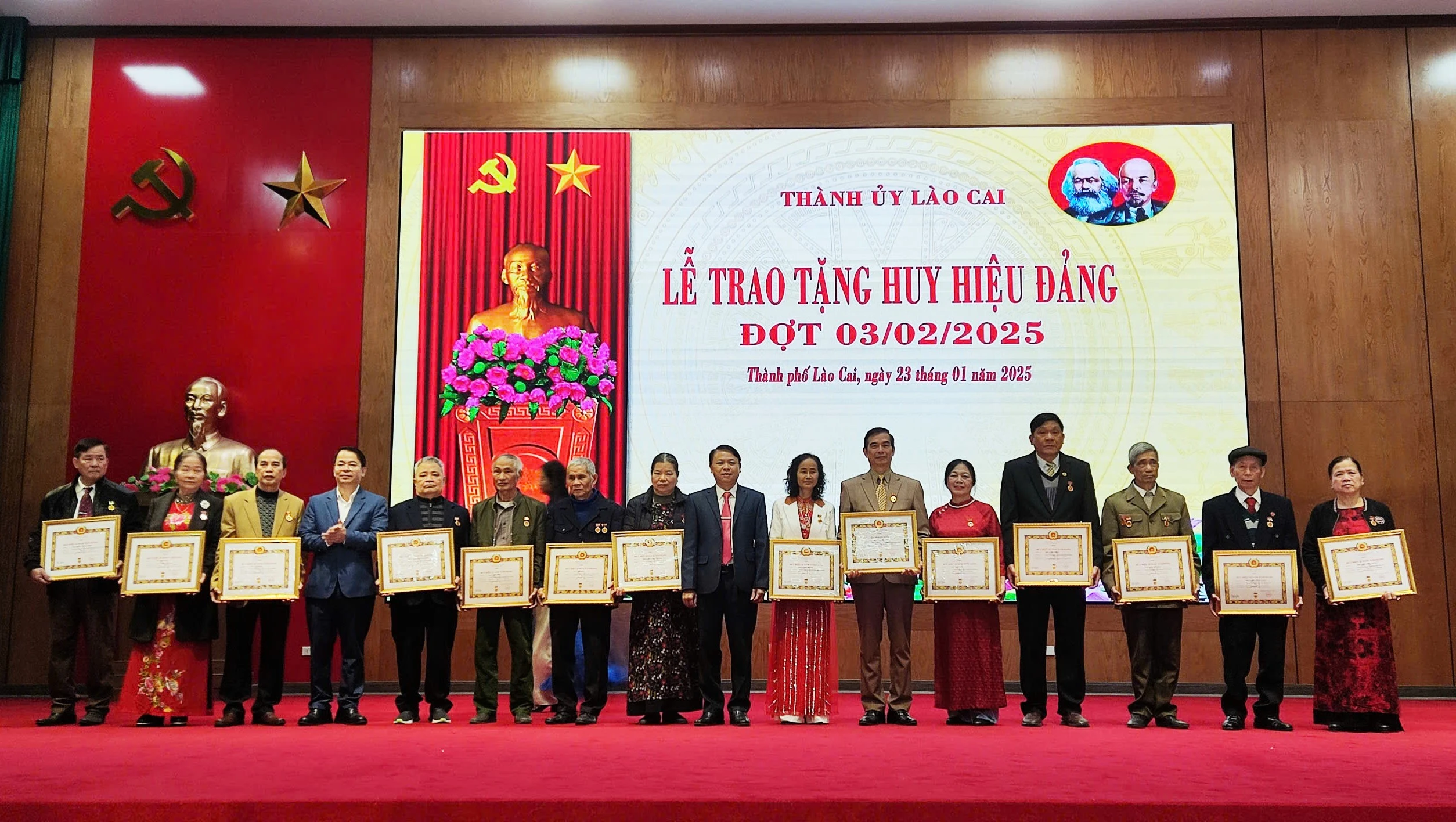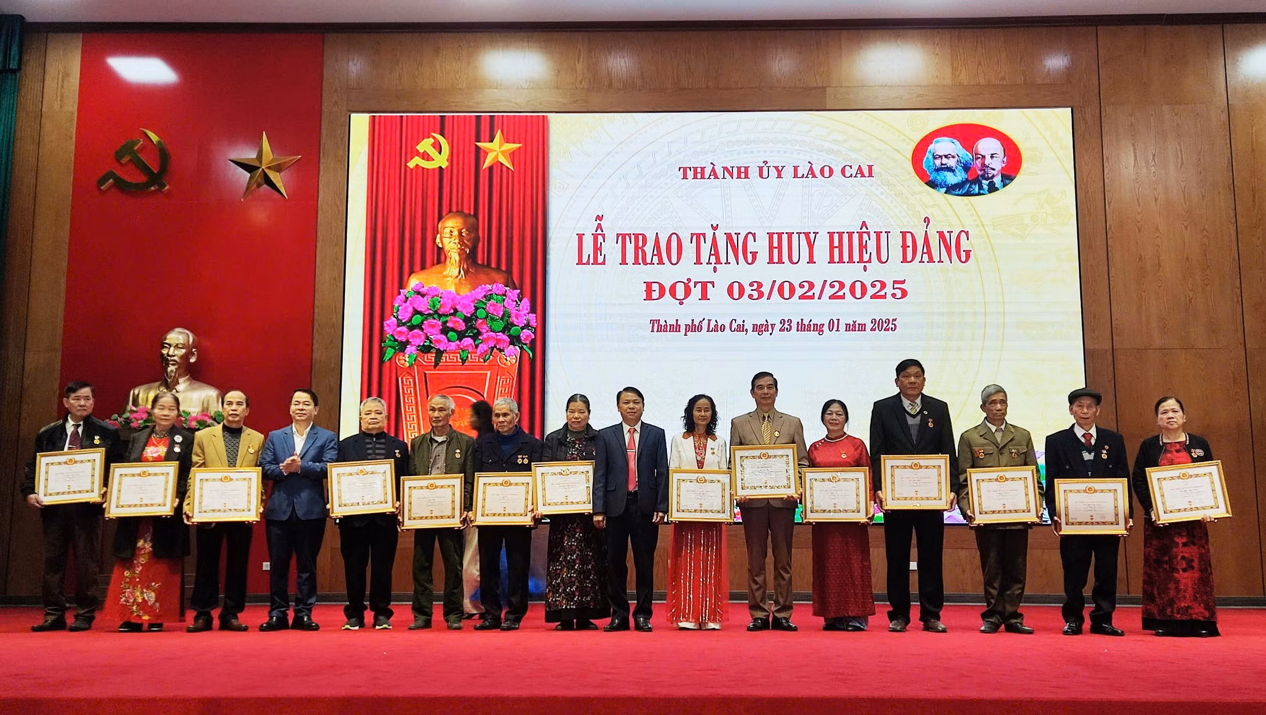 Theo Quyết định của Ban Thường vụ Tỉnh ủy, đợt 3/2/2025, thành phố Lào Cai có 174 đảng viên vinh dự được tặng Huy hiệu Đảng. Trong đó có 2 đảng viên 70 năm, 4 đảng viên 65 năm, 7 đảng viên 60 năm, còn lại là các đảng viên từ 30 đến 45 năm tuổi Đảng. Đảng bộ thành phố Lào Cai cũng truy tặng Huy hiệu 40 năm và 55 năm tuổi Đảng cho 2 đảng viên.