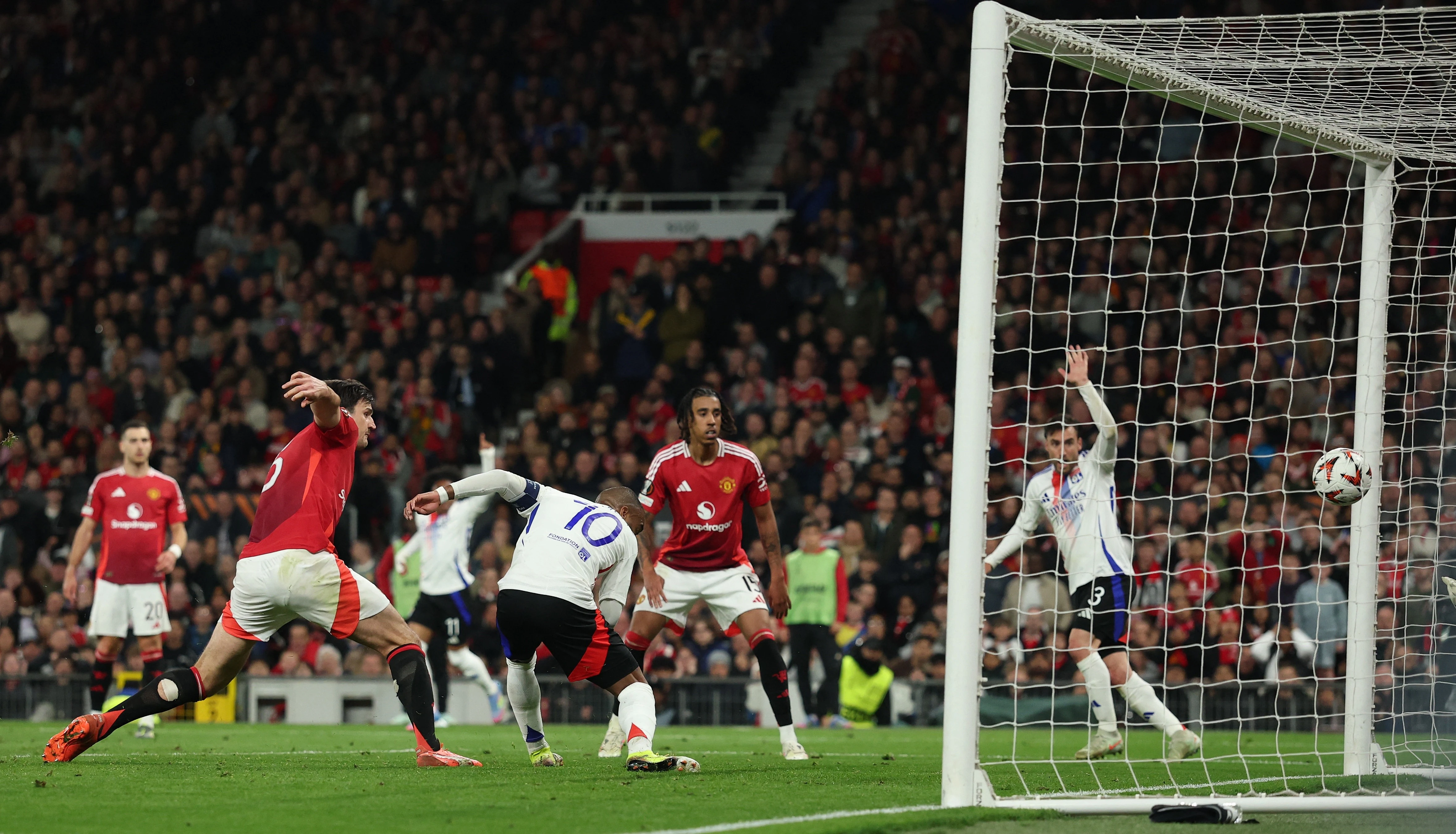MU có lợi thế hơn người nhưng lại chơi đầy bế tắc. Phút 105, ác mộng xảy ra khi Cherki tung cú sút căng từ sát vạch 16,5 m, hạ gục Onana, đồng thời nâng tỷ số lên 3-2 cho Lyon. Đến phút 108, Luke Shaw khiến khán đài Old Trafford câm lặng khi phạm lỗi dẫn đến phạt đền. Lacazette ghi bàn dễ dàng từ cự ly 11 m để nâng tổng tỷ số lên thành 6-4 cho Lyon.