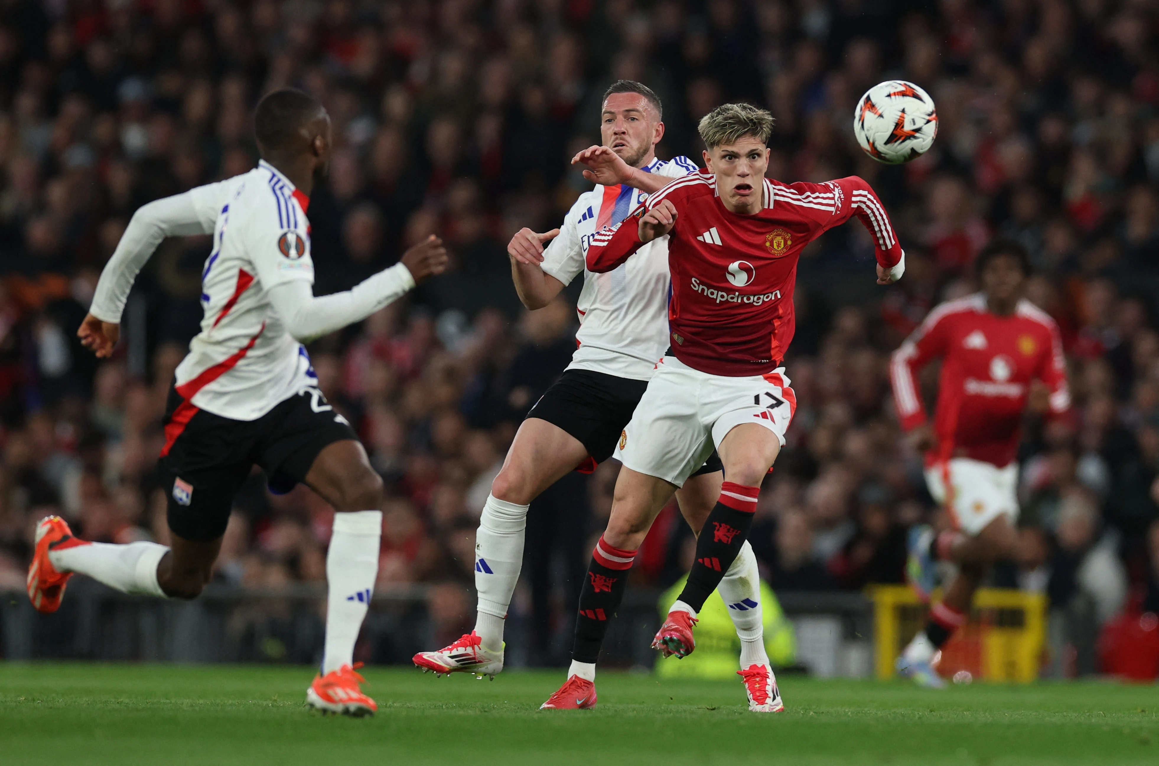 Trước sự cổ vũ cuồng nhiệt của khán giả nhà, Man Utd nhập cuộc đầy hứng khởi và chỉ cần 10 phút để đánh sập hàng thủ Lyon. Sau đường chuyền của Bruno Fernandes, Alejandro Garnacho đẩy bóng qua hai hậu vệ, trước khi chuyền ngược để Manuel Ugarte băng lên dứt điểm từ cự ly gần, mở tỷ số.