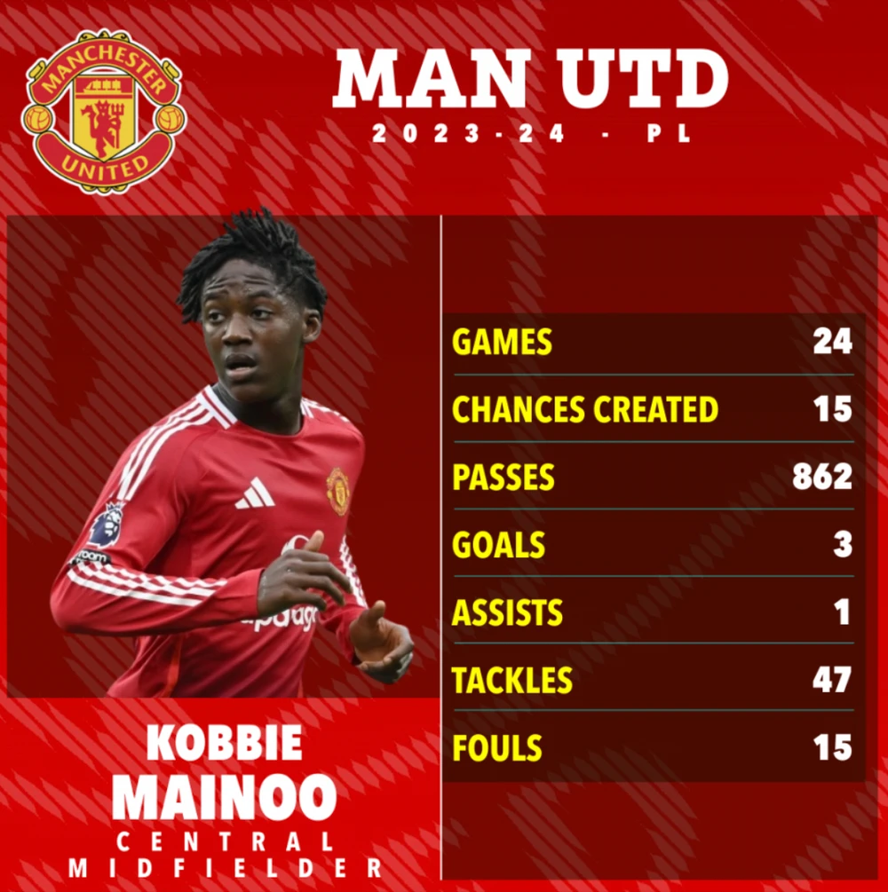 Mainoo có gần nửa mùa giải trước không thi đấu vì dính chấn thương. Nhưng sau khi bình phục, Mainoo lập tức chiếm suất đá chính. Màn trình diễn xuất sắc đó giúp Mainoo lọt vào đội tuyển Anh tham dự Euro 2024. Mainoo dự bị ở vòng bảng nhưng bắt đầu được HLV Gareth Southgate chọn đá chính từ vòng knock-out trong hành trình vào chung kết của Tam sư thua Tây Ban Nha 1-2.