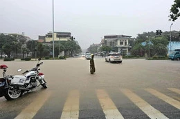 Lực lượng CSGT TP Uông Bí ứng trực tại các địa điểm ngập sâu. Ảnh: Q.M.G