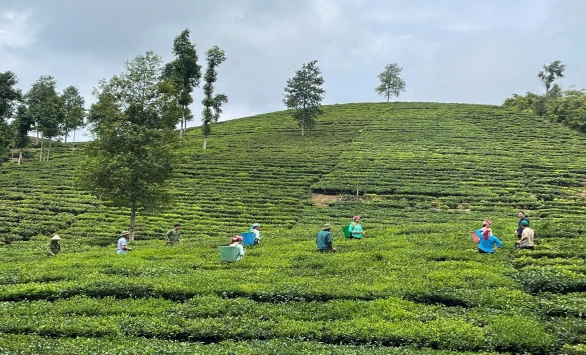 Nông dân thu hoạch chè búp tươi ở xã Bản Sen, huyện Mường Khương.