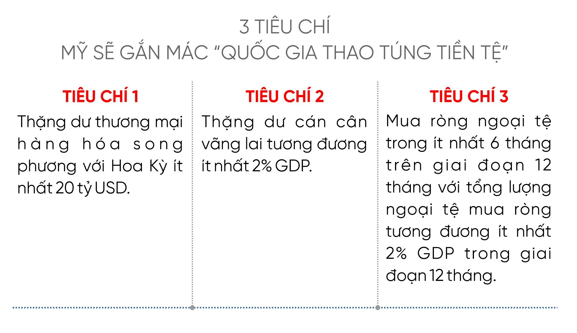 Kể từ đó tới nay, Bộ Tài chính Mỹ đã thực hiện các báo cáo đều đặn dựa trên ba tiêu chí, bao gồm (i) Thặng dư thương mại hàng hóa song phương với Hoa Kỳ ít nhất 20 tỷ USD; (ii) Thặng dư cán cân vãng lai tương đương ít nhất 2% GDP; (iii) Can thiệp một chiều và kéo dài trên thị trường ngoại tệ, thể hiện qua việc mua ròng ngoại tệ trong ít nhất 6 tháng trên giai đoạn 12 tháng với tổng lượng ngoại tệ mua ròng tương đương ít nhất 2% GDP trong giai đoạn 12 tháng. Khi một quốc gia “thỏa mãn” cả ba tiêu chí này, Mỹ sẽ gán mác “quốc gia thao túng tiền tệ” và các bước tiếp theo được tiến hành.