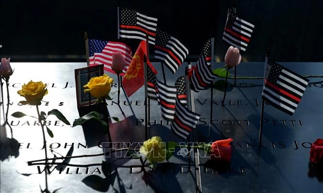 Cờ và hoa được đặt tại Viện Bảo tàng và Đài tưởng niệm quốc gia, tưởng nhớ các nạn nhân vụ tấn công khủng bố 11/9 ở Lầu Năm góc, Washington, DC., ngày 11/9/2021. Ảnh: AFP/TTXVN