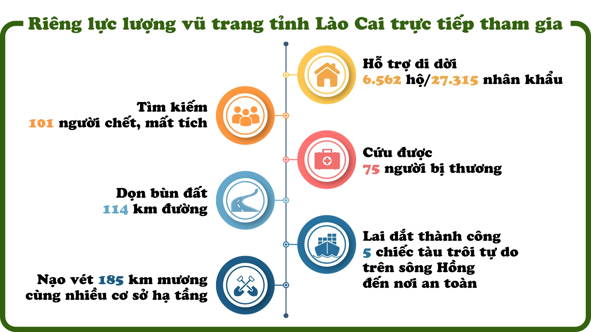 Đặc biệt, quá trình khắc phục hậu quả thiên tai trên địa bàn tỉnh, Bộ CHQS tỉnh kịp thời tham mưu huy động tối đa lực lượng, phương tiện tại chỗ, từ cấp xã, huyện, đến cấp tỉnh. Khi tình hình thiên tai xảy ra ở mức độ nghiêm trọng, trên nhiều địa bàn, vượt quá khả năng của tỉnh, Bộ CHQS tỉnh Lào Cai kịp thời tham mưu cho Tỉnh ủy, UBND tỉnh và báo cáo, đề nghị tăng cường lực lượng, phương tiện của Quân khu 2 và đơn vị bạn để tham gia công tác tìm kiếm cứu nạn; huy động 8.096 cán bộ, chiến sĩ bộ đội thường trực, dân quân, tự vệ với hơn 23.810 ngày công, hơn 400 lượt phương tiện các loại tham gia cứu hộ, cứu nạn và khắc phục hậu quả thiên tai.