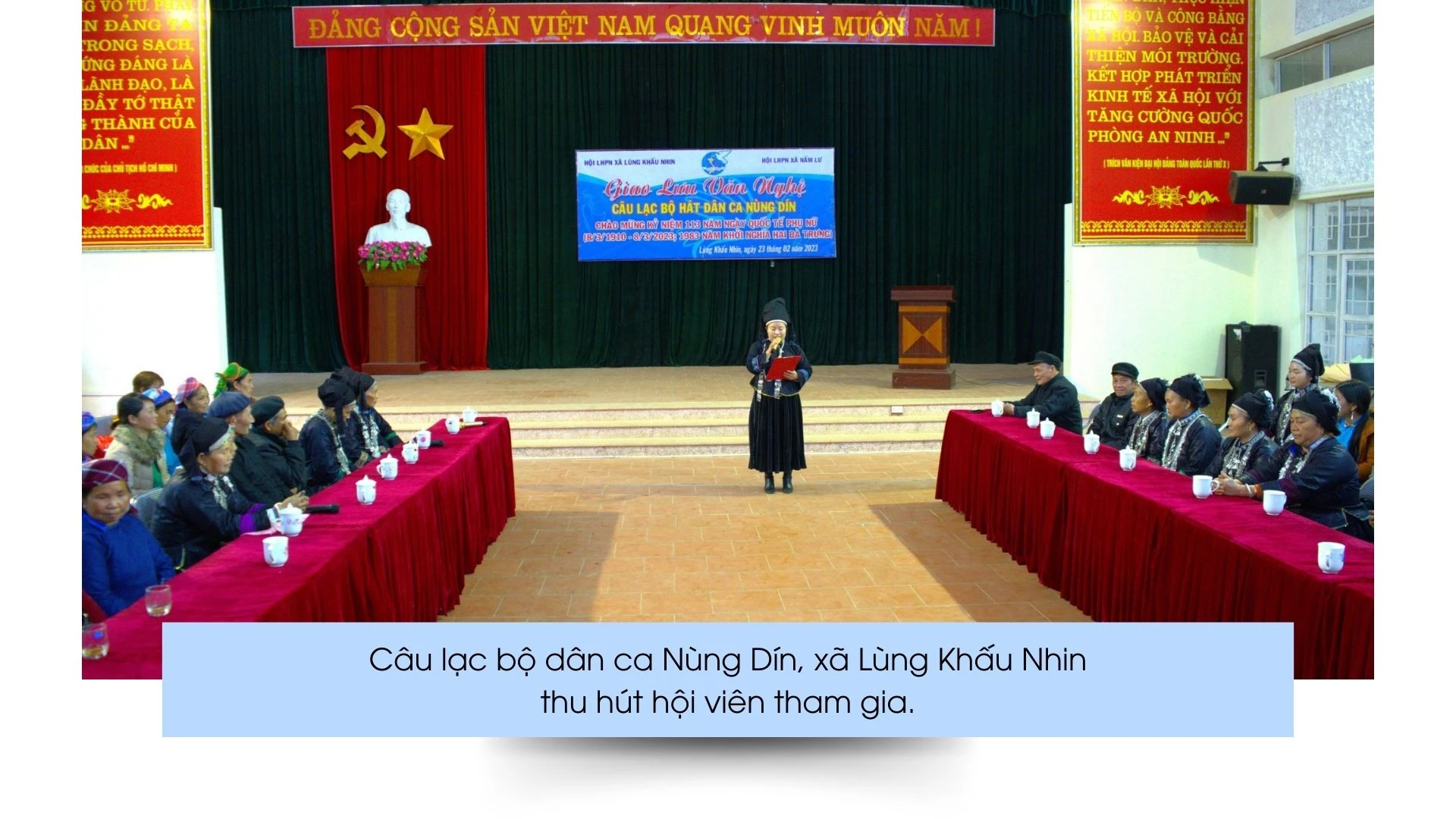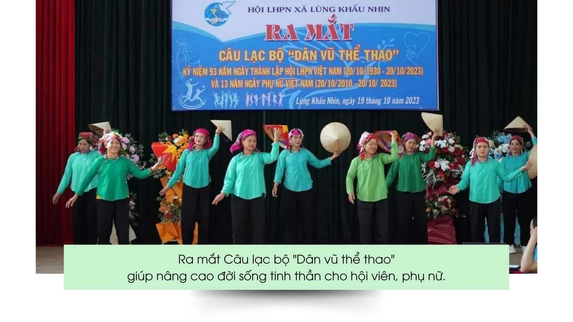 Bên cạnh các hoạt động hỗ trợ cộng đồng, Hội Phụ nữ xã Lùng Khấu Nhin còn thành lập mô hình Câu lạc bộ dân ca, dân vũ Nùng Dín, với 34 thành viên. Hội cũng tích cực thực hiện Cuộc vận động “Xây dựng gia đình 5 không, 3 sạch”, “Nhà sạch, vườn đẹp” thông qua tổ chức tổng vệ sinh đường làng, ngõ xóm, trồng cây, trồng hoa ven đường, hiến đất làm đường giao thông nông thôn…