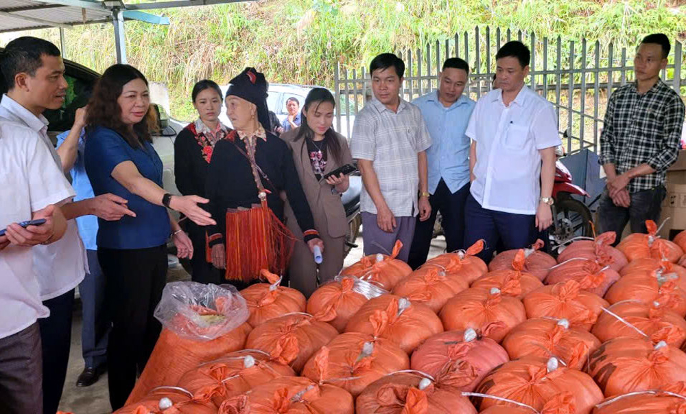 Đồng chí Hoàng Thị Vĩnh - nguyên Ủy viên Ban Thường vụ Tỉnh ủy, Trưởng Ban Dân vận Tỉnh ủy (thứ 2, từ trái sang) thăm mô hình chế biến măng sặt của người dân xã Nậm Lành, huyện Văn Chấn.
