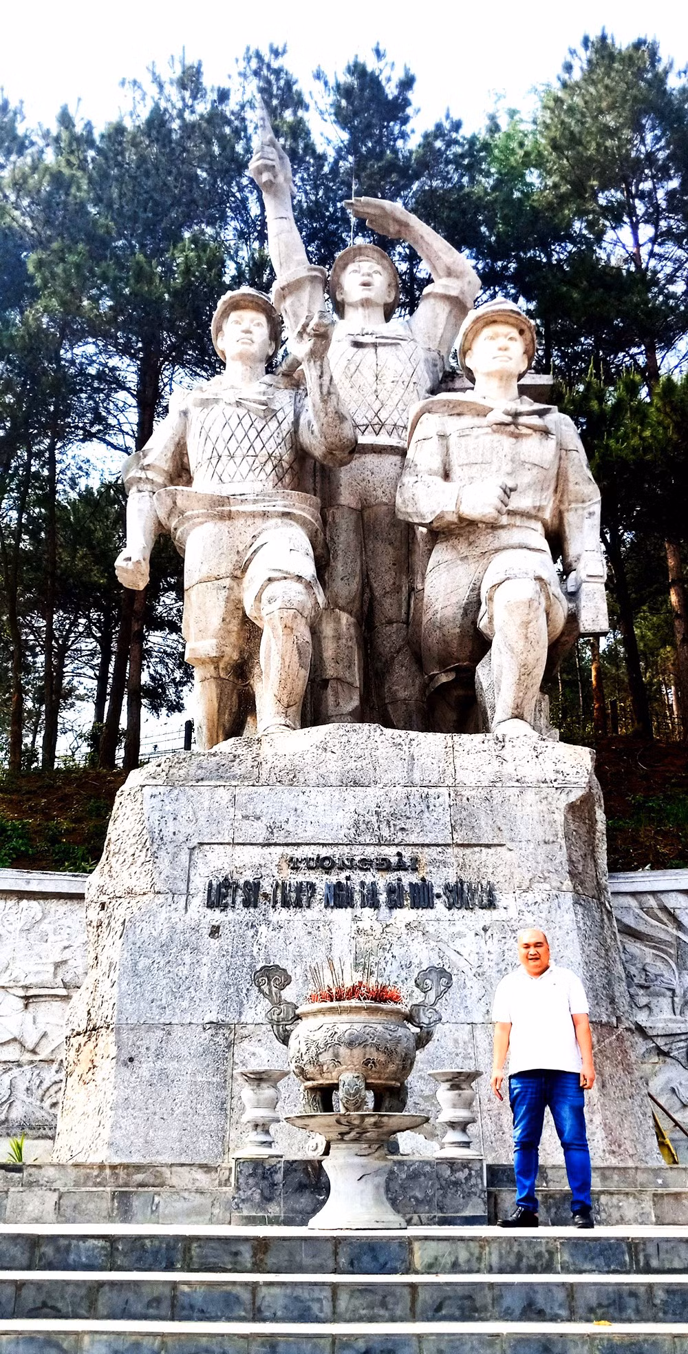 Tác giả - nhà báo Dương Hoài Văn (Báo Yên Bái) bên tượng đài liệt sỹ thanh niên xung phong trong quần thể di tích Ngã ba Cò Nòi.